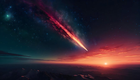 A vibrant comet illuminates a fiery sunset over snow-capped mountains. A breathtaking celestial scene.