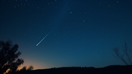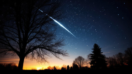 A brilliant meteor blazes across a vast, star-dusted night sky, leaving a luminous trail above a dark forest silhouette, capturing the awe-inspiring wonder of cosmic events, perfect for space and astronomy themes.