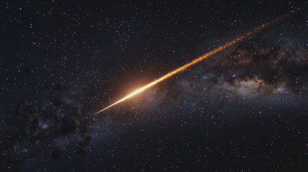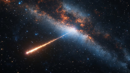 Burning comet tail streaking across the night sky, surrounded by bright stars and deep nebulae generative ai