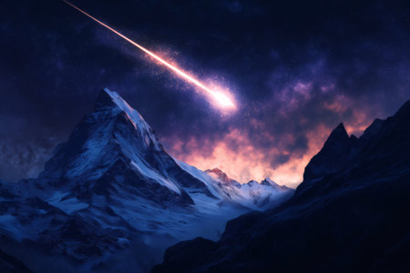 Breathtaking meteor shower illuminating the night sky above a majestic snowy mountain range, creating a stunning cosmic spectacle