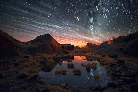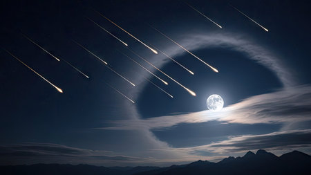 Spectacular meteor shower lights up the night sky with bright streaks over mountain landscape
