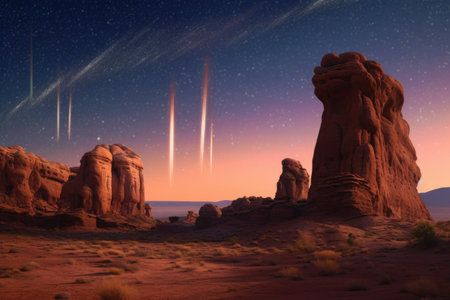 meteor streaks over desert rock formations and arches, created with generative ai