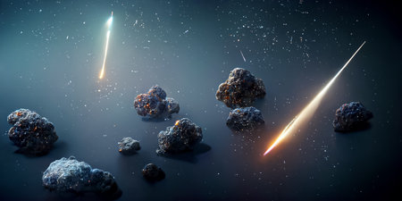 Gray and irregular shaped celestial bodies of meteorites, comets and asteroids on starry 3D illustration