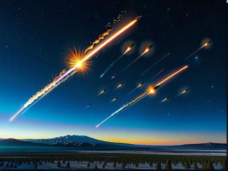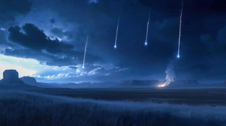 Bright meteors falling from the night sky, leaving trails of light as they head towards a distant mountain range under a starlit sky