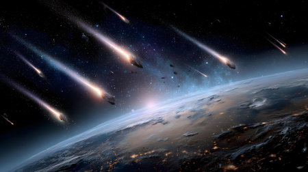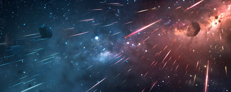 Bright meteors illuminate a dark cosmic background filled with stars and glowing gas clouds.