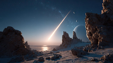 A comet in the night sky over the sea. 3d rendering. Generative Ai.