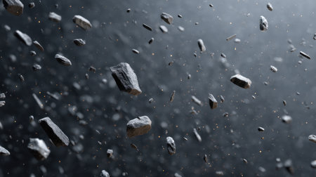 Abstract 3D render showcasing flying particles and rocks suspended in a dark backdrop with soft light effects. This artwork conveys a sense of motion and depth.