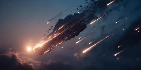 Fiery asteroid shooting through space, leaving a trail of bright flames and debris against the night sky.