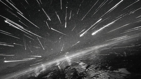 A surreal shot of a meteor shower streaking across the night sky, with bright trails of light cutting through the darkness like celestial fireworks. ai