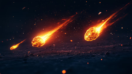 Two burning asteroids streaking through a planets atmosphere create a spectacular fiery display, illuminating the dark expanse of space with intense heat and energy