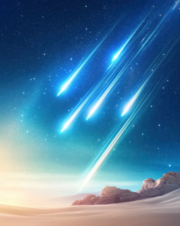 A meteor shower in clear night sky with streaks of light and stars, cosmic wonder, awe inspiring