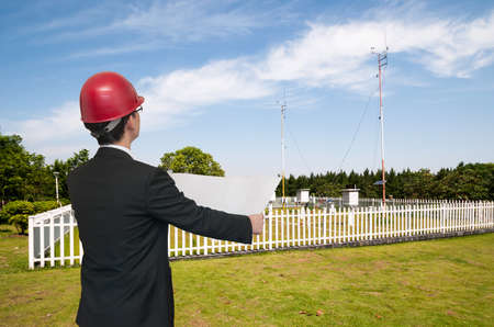 Technician male working collecting Air pollution, Weather monitor, Wind information data from sensor station outdoor