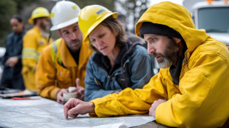 Construction workers wearing protective equipment in foggy conditions at industrial site. for workplace safety, construction industry, teamwork concepts.