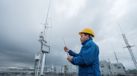 Medium shot of a weather station technician calibrating instruments while monitoring fluctuating wind speeds and environmental data for local weather forecasts
