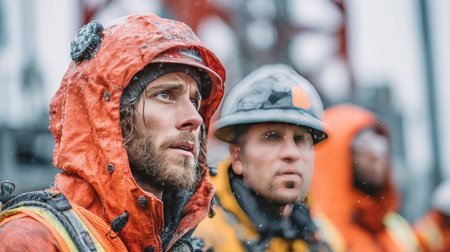 Two focused construction workers in bright rain gear, standing at a job site as snow falls around them, showcasing dedication and resilience in harsh conditions.