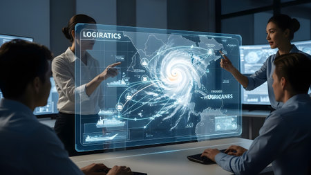 Team of people analyzing a hurricane's path on a futuristic holographic logistics display.
