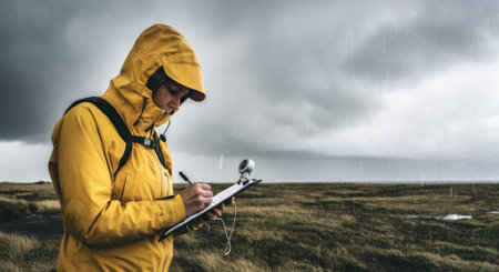 Asian female scientist taking notes in rainy field wearing yellow raincoat