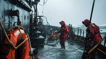 Workers in warm clothing braving extreme blizzard conditions while working on a ship, with snow and ice covering their gear