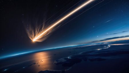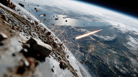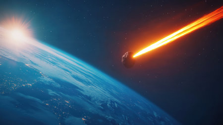 A breathtaking space scene showcasing a fiery meteor streaking over Earth