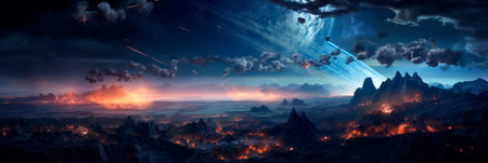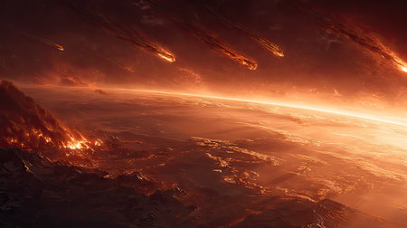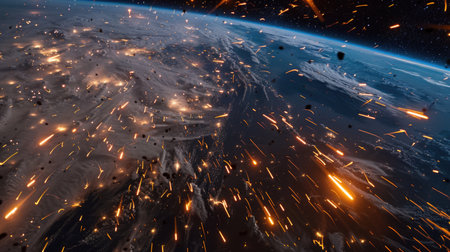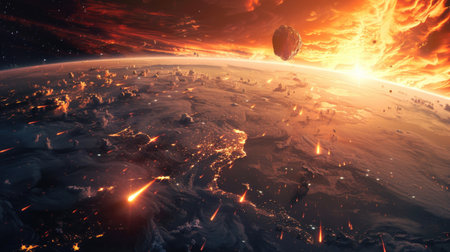 A dramatic display of asteroids and meteors engulfing Earth in flames showcases a cataclysmic event. Fiery trails and bright explosions create a vivid portrayal of cosmic destruction.