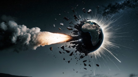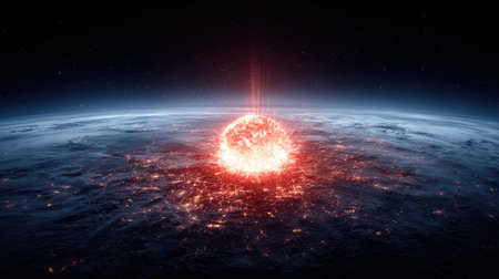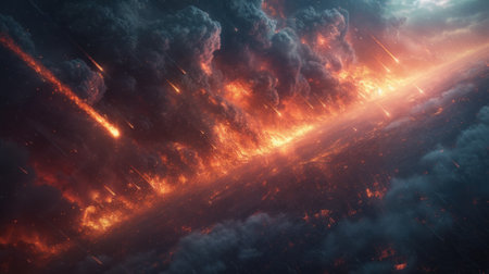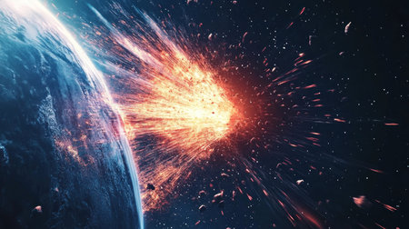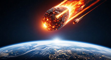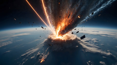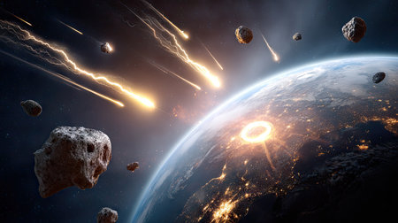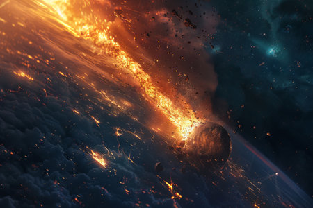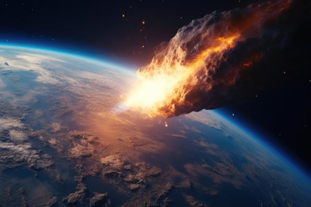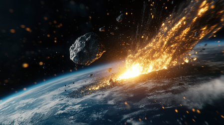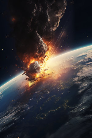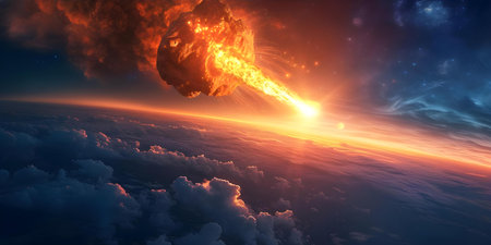 Apocalyptic scene of asteroid approaching Earth, cosmic impact, fiery comets, burning atmosphere, and global chaos concept