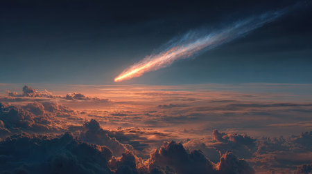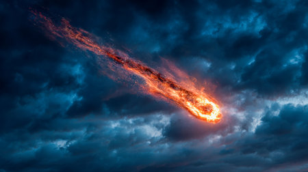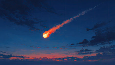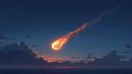 A fiery meteor streaks across a twilight sky, creating a dramatic visual display. Vibrant orange and yellow hues highlight the meteor against a deep blue night sky. Soft, billowy clouds are visible around the edges of the horizon. The image is suitable for use in commercial or editorial contexts related to space exploration, cosmic events, or natural phenomena.