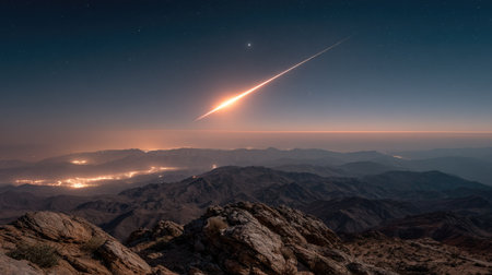 Breathtaking panoramic view of a desert mountain range at night, with a prominent meteor streaking across the inky sky. A valley below is illuminated by city lights, showcasing the contrast between the natural and urban landscapes.