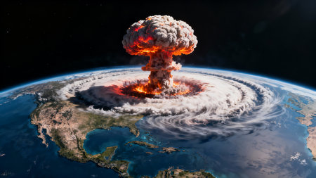 Shattered globe amidst nuclear explosion in space