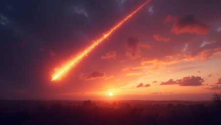 Dramatic fiery meteor blazing through colorful sunset sky