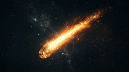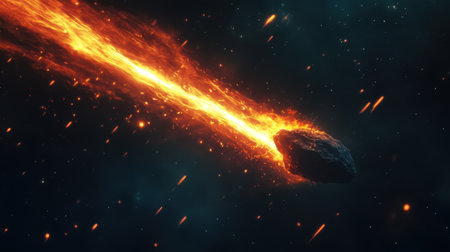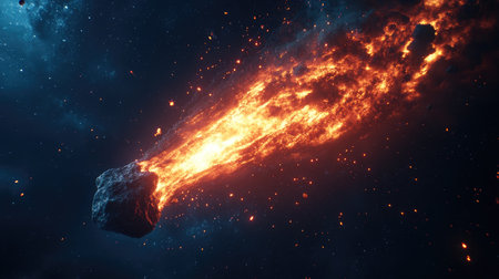 Fiery asteroid shooting through space, leaving a trail of bright flames and debris against the night sky.