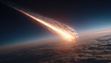 Fiery asteroid entering earth's atmosphere with blazing trail above swirling clouds and dramatic planet curvature in outer space.