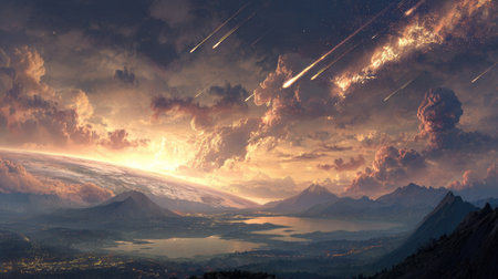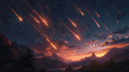 An illustration depicts a stunning meteor shower streaking across a cloudy sky above a mountainous terrain. The artwork showcases dynamic lighting, with warm hues dominating the upper portion and cooler tones in the valley below. This image could be suitable for fantasy art projects or scenic backgrounds.