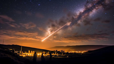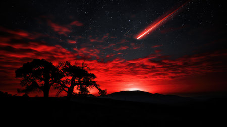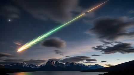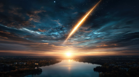 A bright, fiery meteor streaks across a dark night sky, with clouds and a vibrant sunset color palette. The image features vivid colors, a dramatic composition, and suggestive of a night sky scene. The image could be used for various purposes, such as in editorial or commercial applications that highlight natural phenomena and awe-inspiring visual displays.