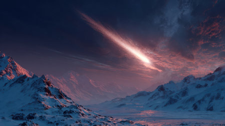 A giant comet streaks above a snowy mountain range on Earth, reflecting fiery light on the icy peaks, dramatic movie style