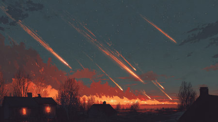 Meteors streak across the night sky creating a breathtaking spectacle over a serene village.
