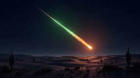 A brilliant meteor or fireball streaks across the starry night sky above a desert landscape filled with cacti. The green and orange trail of the shooting star illuminates the dark sand dunes and wilderness.