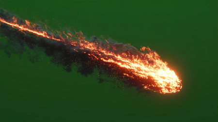 Fiery meteoroid falling on green screen