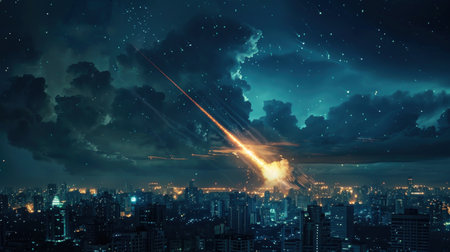Dramatic depiction of a meteor shower with fiery trails over a brightly lit cityscape under a starry night sky.
