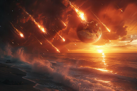 Digital artwork of photo of the earth being hit by meteors, over an ocean with waves crashing on the shore. the sky is dark and orange as if it were night time. a few large fireball shaped meteorites can be seen in midair.