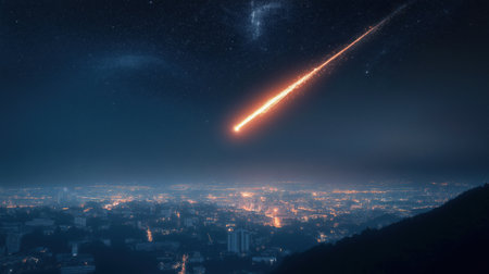 A bright meteor streaking through the night sky above a city filled with lights, with stars and a distant galaxy in the background