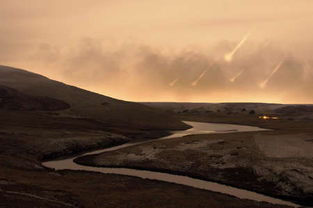 An end of the world concept. Looking across a river and the countryside with meteorites flying towards the earth with smoke on the horizon.