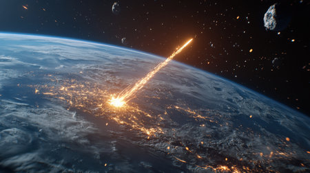 Huge asteroid impact event hurtling towards earth over city lights on surface. Earth is showing city lights on surface. Apocalyptic glowing background.