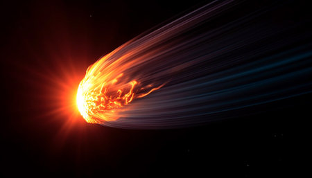 A fiery asteroid streaking through space with glowing fire trails, falling against a deep black background, evoking cosmic energy and danger