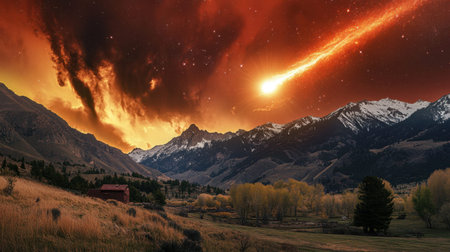 A stunning landscape showcasing majestic mountains and a fiery sky illuminated by a meteor shower, capturing the breathtaking natural beauty of this serene wilderness scene.