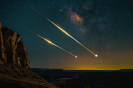 Bright meteors blaze through space, creating a stunning spectacle above Earth during nightfall.