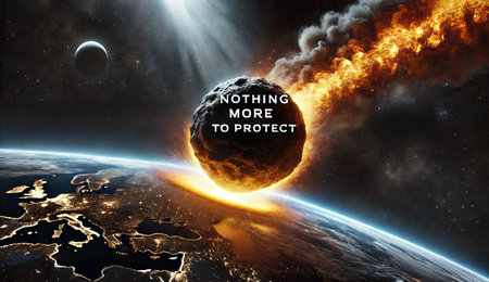 Massive asteroid with a fiery tail colliding with Earth, accompanied by the phrase Nothing More to Protect. Concept of cosmic destruction, apocalyptic scenarios, and humanity's vulnerability.