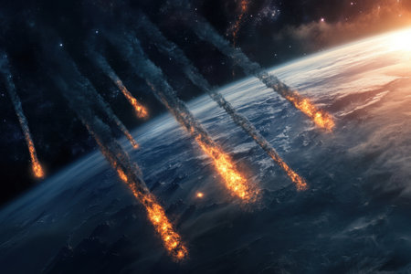 fiery asteroids falling to earth, realistic illustration