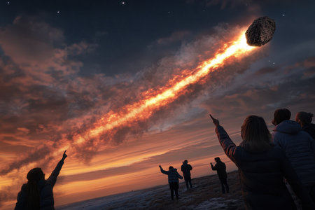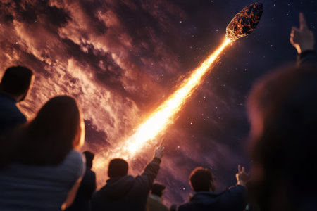 Crowds gather in awe as a meteor streaks across the night sky, illuminating the dark landscape with fiery brilliance.