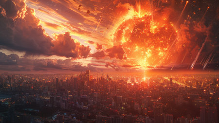 The meteorites explode in the sky above the city in this sci-fi scene, painted in an illustration style, with a digital art style