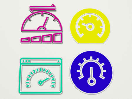 speedometer made by 3D illustration of a shiny metallic sculpture on a wall with light background. car and icon